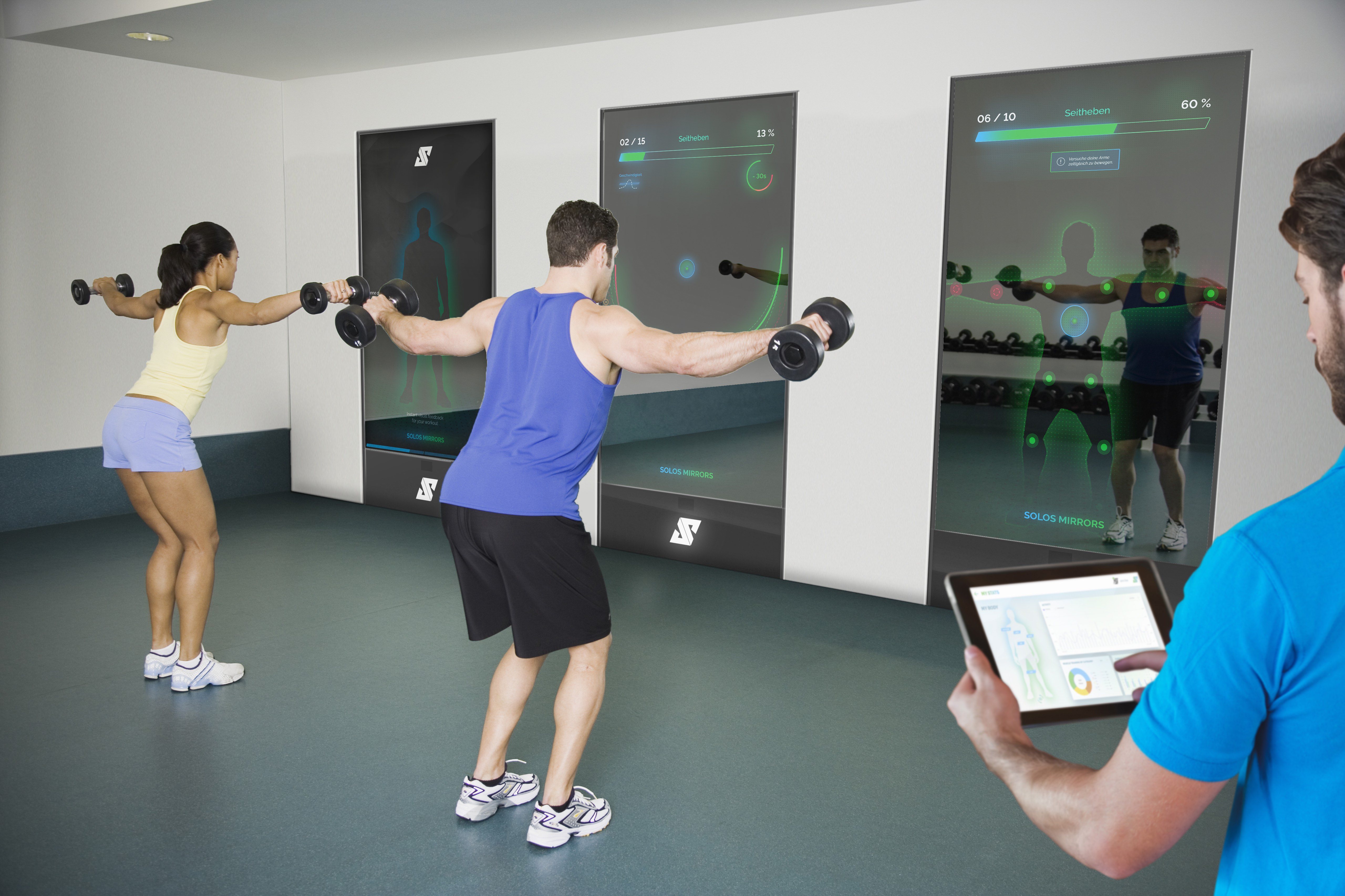 SOLOS is a digital personal fitness trainer. It is a revolutionary and state-of-the-art digital mirror consisting of advanced sensors, display and semi-transparent mirror. The sensors capture human body movements from a distance, without the user having to carry anything on the body. SOLOS provides meaningful and prompt real-time feedback directly on the mirror surface. SOLOS shows how to perform an exercise and visualizes the instant feedback by showing digital elements in the mirror. The users know always if they are training right or wrong.