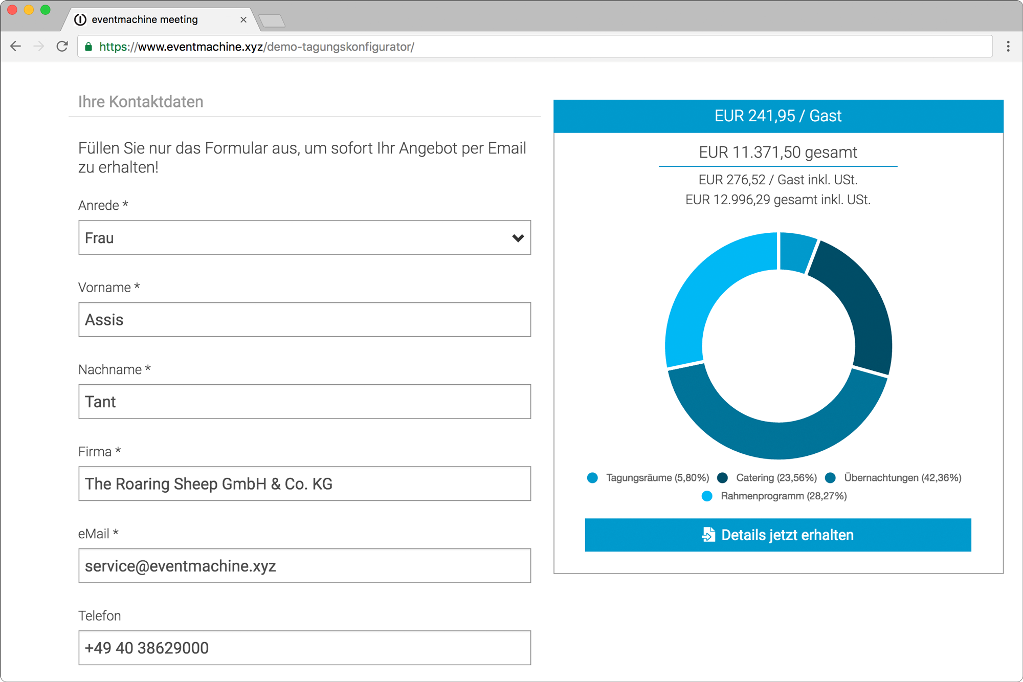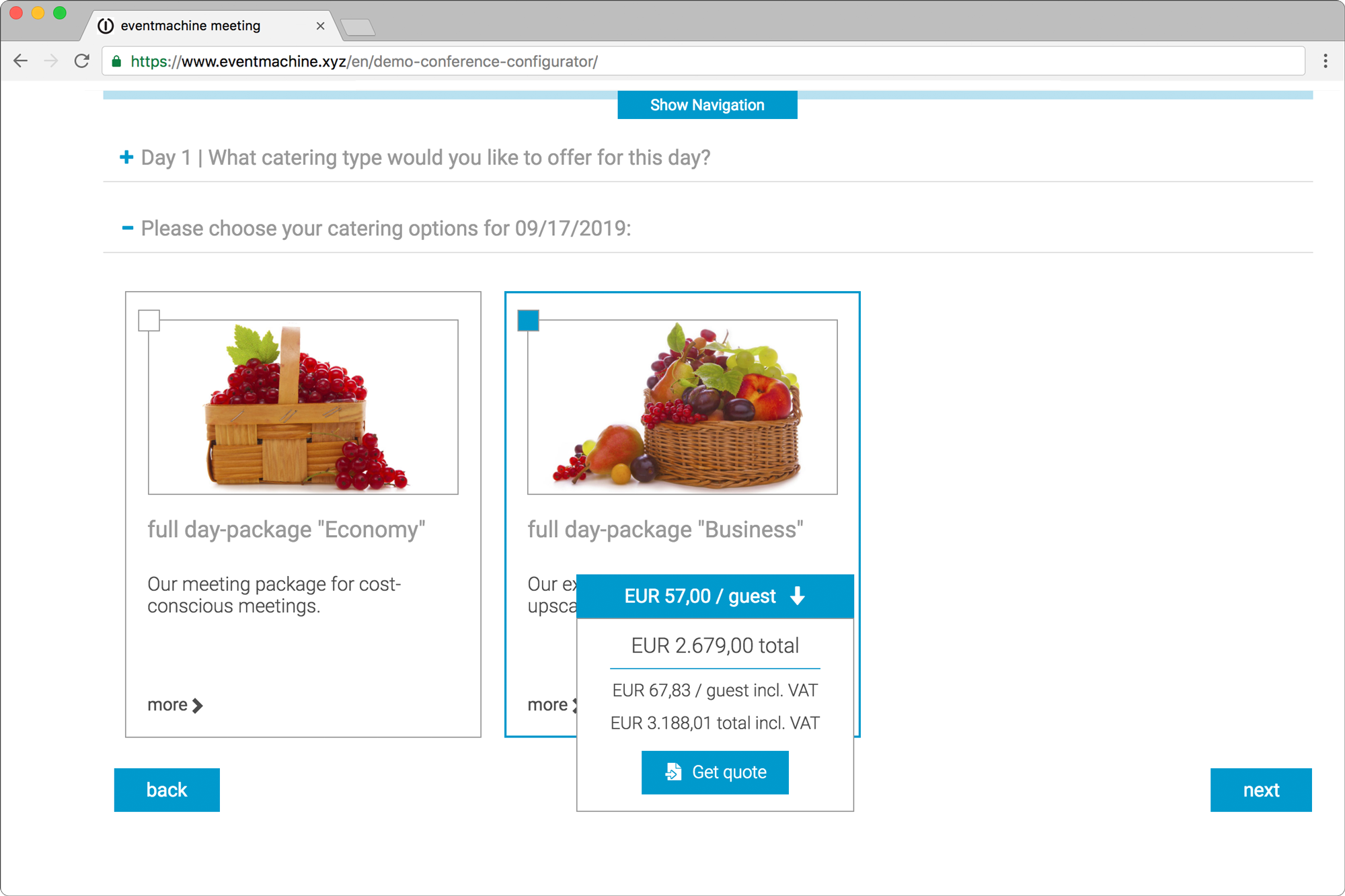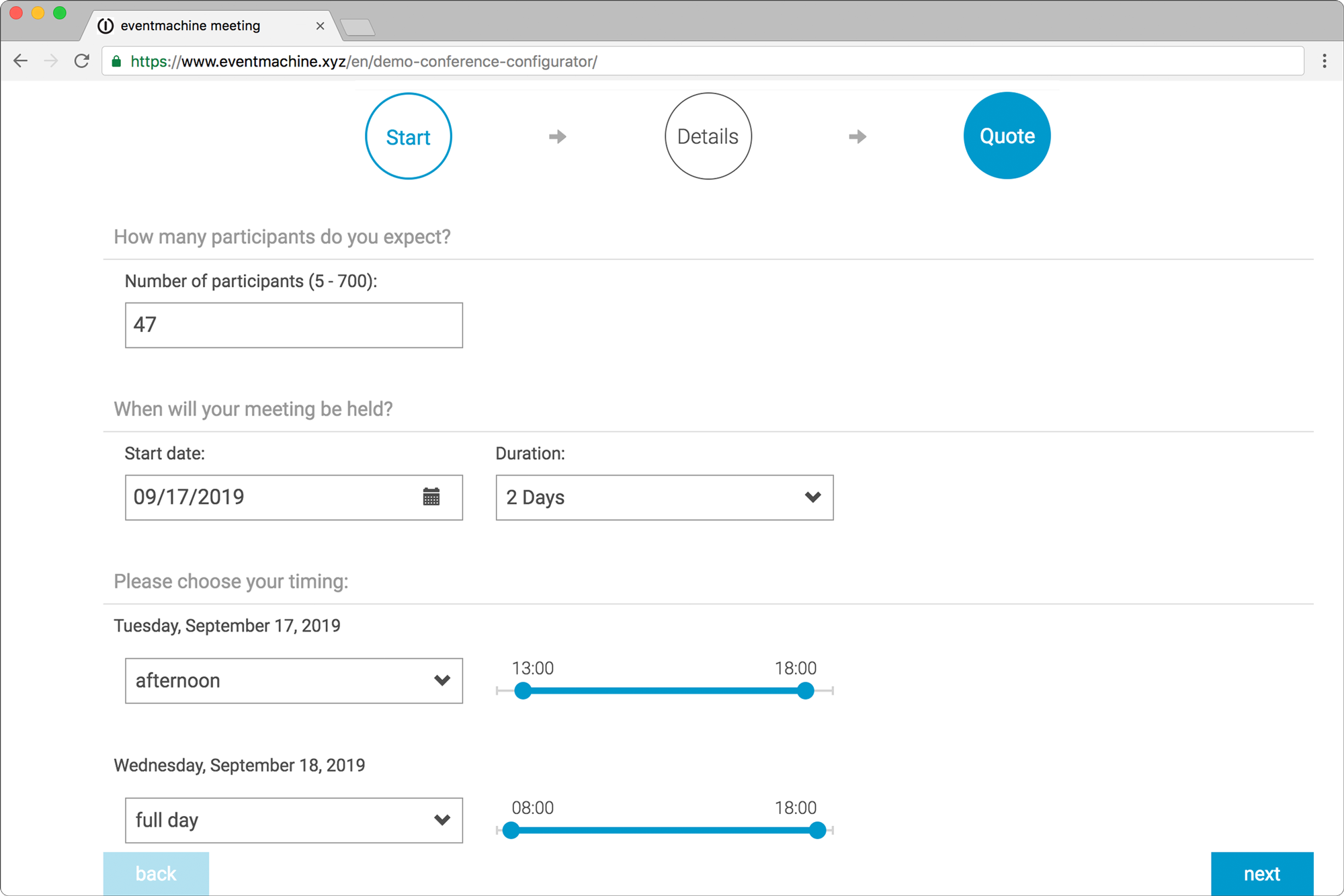 EVENTMACHINE's cloud solution is embedded seamlessly in the client’s website, using the client’s own website styling and corporate image. Users configure their desired event, and EVENTMACHINE automatically generates and sends out customized PDF quotes. Quoted prices are perfectly-tailored by the integrated MICE revenue management system (“Smart Quotes”).