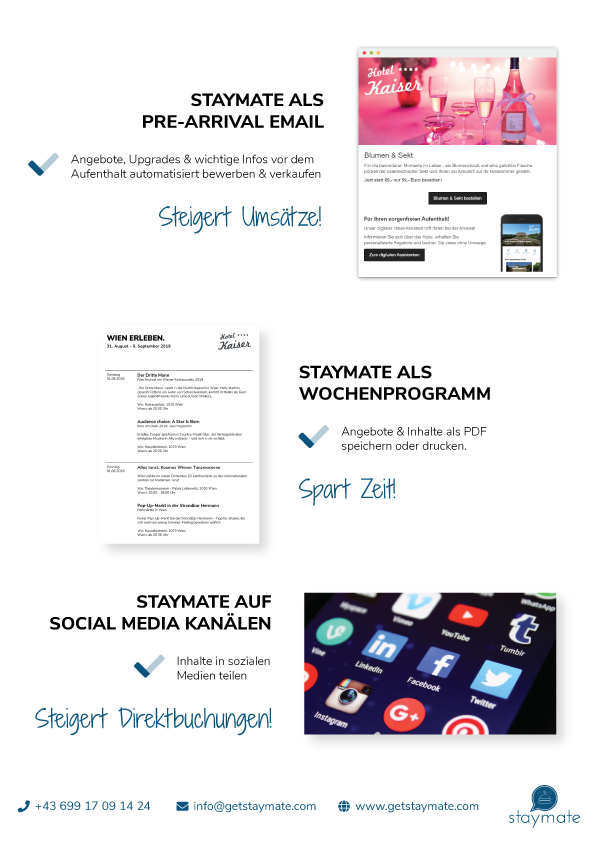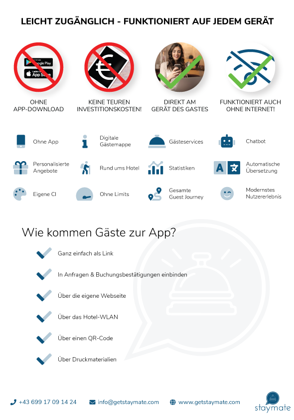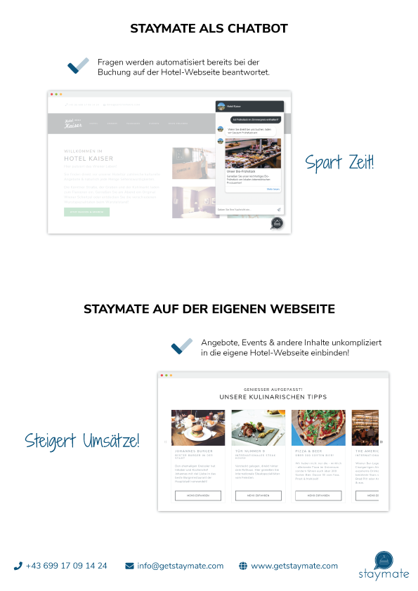 Our assistant learns from you and passes on your knowledge, recommendations and offers to your guests. This is how we close a gap that Internet platforms cannot fill, because your guests belongs to you! Guest app, chatbot and website widgets are all based on a single knowledge base. Thus, Staymate communicates the right content, at the right time, in the right place.